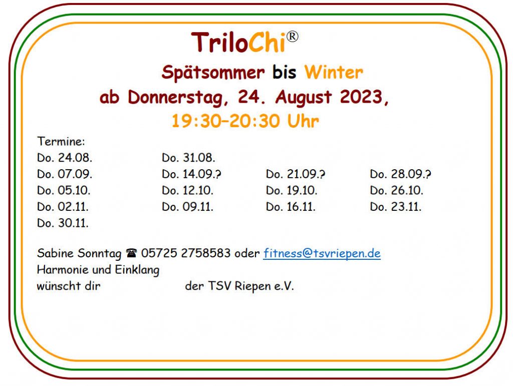 Neuer TriloChi-Block 7. August 2023 Gymnastik Ein neuer TriloChi-Bloch mit Sabine beginnt Ende August. Alle Termine beim klick auf das Bild! Teilen mit: Klick, um auf Facebook zu teilen (Wird in neuem Fenster geöffnet) Facebook Klicke, um auf X zu teilen (Wird in neuem Fenster geöffnet) X Klicken, um auf WhatsApp zu teilen (Wird in neuem Fenster geöffnet) WhatsApp Klicken, um auf Telegram zu teilen (Wird in neuem Fenster geöffnet) Telegram Klicken, um einem Freund einen Link per E-Mail zu senden (Wird in neuem Fenster geöffnet) E-Mail Beitrags-Navigation Zurück Vorheriger Beitrag: Neu: Discofox im TSVWeiter Nächster Beitrag: TSV unterstützt Shield Ghosts